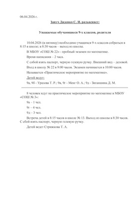 11.02.2026 г. состоится Итоговое собеседование в 9-х классах согласно утвержденному порядку.